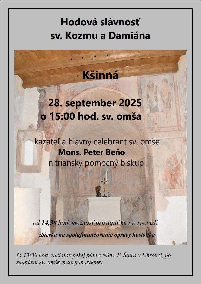 Slávnostná svätá omša sa uskutoční 28. septembra 2025 o 15:00 hod. pri kostolíku sv. Kozmu a Damiána v Kšinnej.
